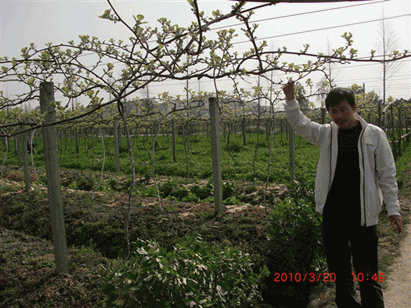 圖為:公司技術(shù)員站在獼猴桃樹(shù)下喜笑顏開(kāi)