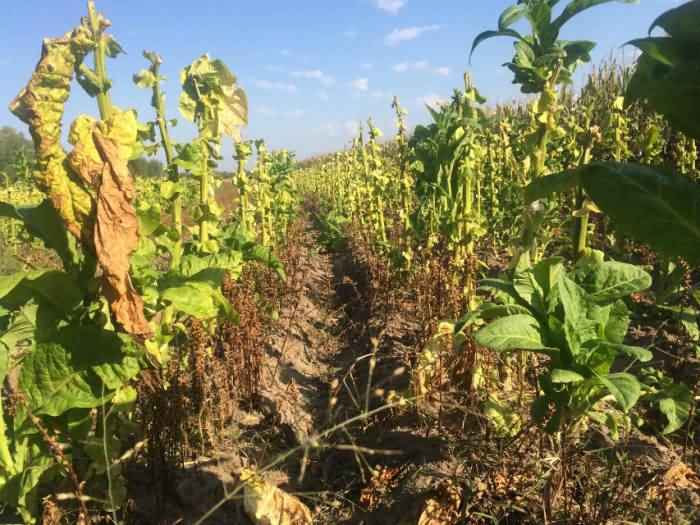 圖4:吉林省鎮(zhèn)賚縣煙草列當(dāng)危害嚴(yán)重,這個(gè)煙葉畝產(chǎn)不足300斤,且次品煙葉占50%。