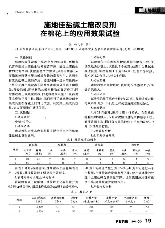《農(nóng)村科技》2011年第1期 “施地佳”鹽堿土壤改良劑在棉花上的應(yīng)用效果試驗