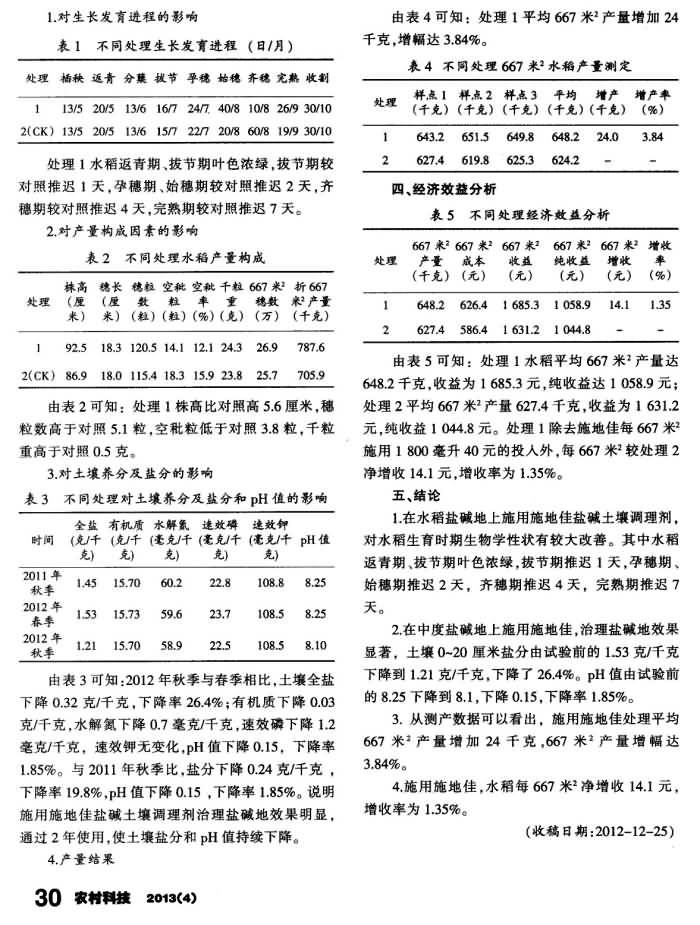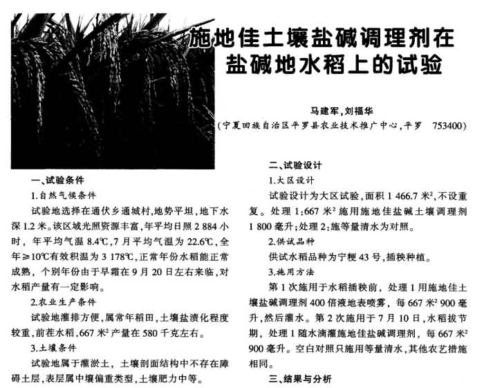 《農(nóng)村科技》2013年第4期 “施地佳”土壤鹽堿調(diào)理劑在鹽堿地水稻上的試驗(yàn)