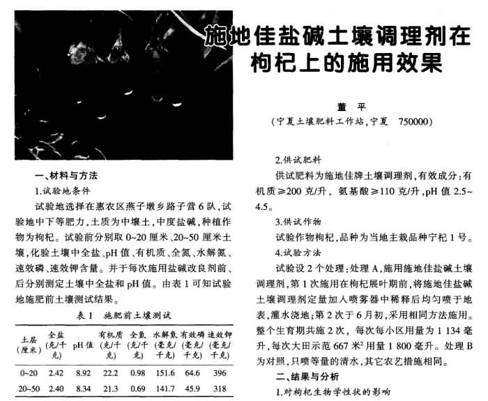 《農(nóng)村科技》2013年第5期 “施地佳”土壤鹽堿調(diào)理劑在枸杞上的施用效果