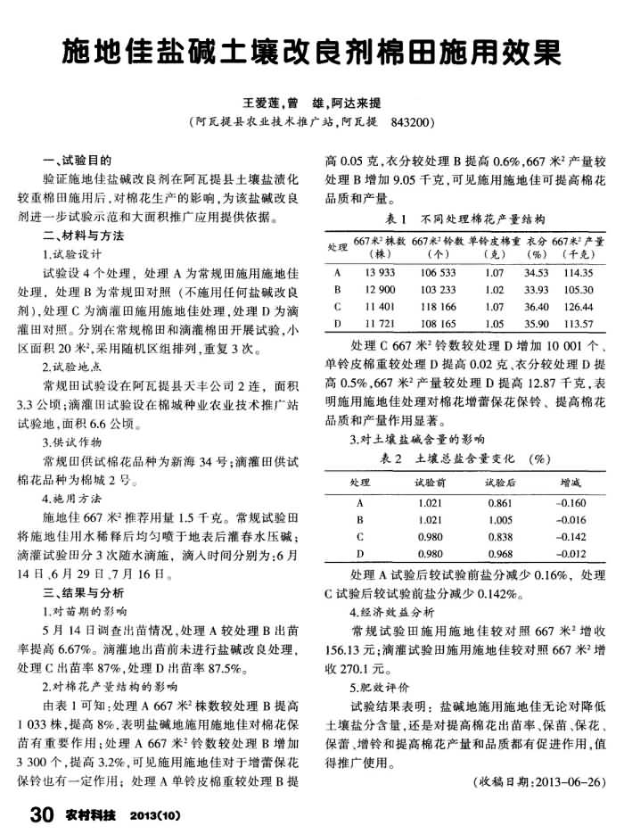 《農(nóng)村科技》2013年第10期 “施地佳”鹽堿土壤改良劑棉田施用效果
