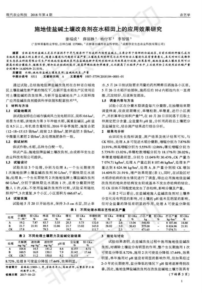 施地佳鹽堿土壤改良劑在水稻田上的應用效果研究